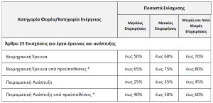 Το ποσοστό της ενίσχυσης μπορεί να ανέλθει έως 80%, ανάλογα με την κατηγορία έρευνας και το είδος Φορέα και συνεργασίας μεταξύ Φορέων ως εξής: